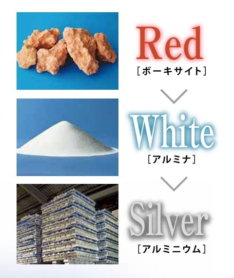 赤茶色のボーキサイトを細かく砕き、薬品と混ぜ合わせて分離すると「アルミナ」という真っ白な粉ができあがる。このアルミナは、アルミニウムと酸素が結びついた状態なので、次に電気分解によってアルミナから酸素を取り除く。こうして銀色のアルミニウムが誕生する。