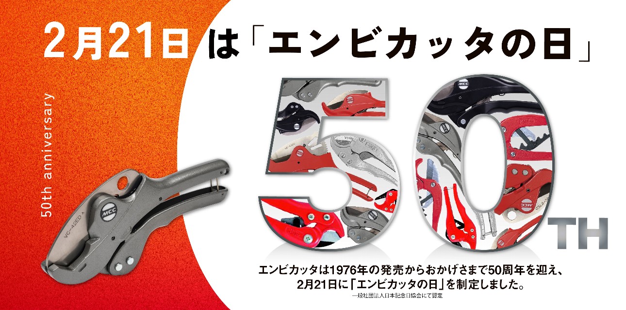 日付はMCCが初めて開発した塩ビ管(硬質ポリ塩化ビニル管)を切断するための専用工具「エンビカッタ」の発売日1976年(昭和51年)2月21日から2月21日を記念日としたもの。