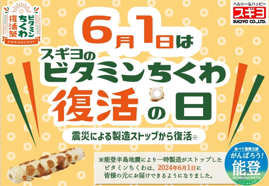 生産量の7割が長野県内に出荷され、「信州のソウルフード」とも言われる「スギヨのビタミンちくわ」。2024年(令和6年)1月1日に発生した能登半島地震の被災により製造中止となったが、その流通を担うマルイチ産商が中心となり「ビタミンちくわ」の復活を盛り上げた。