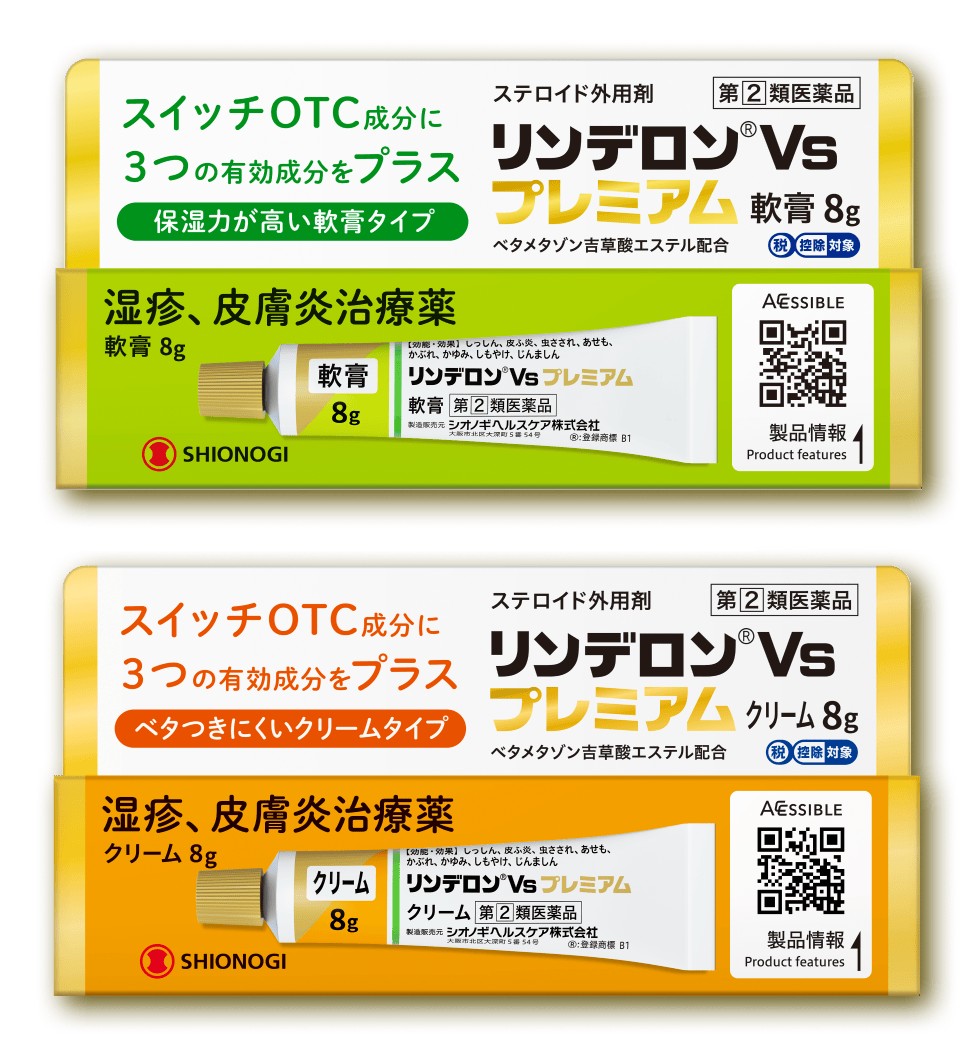 「リンデロンVs」は、スイッチOTC成分に、3つの有効成分をプラス。皮膚の細胞増殖を促進して患部の治りを促す。「リンデロンVs」には軟膏・クリーム・ローションの3つの剤形があり、塗る部位や患部の状態に合わせたものを選ぶことができる。
